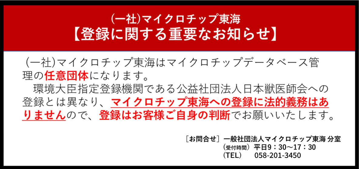 ◎動物病院でマイクロチップを装着しただけでは、所有者(=飼い主)の情報と照合することはできませんので、マイクロチップのデータベース登録をしてください。